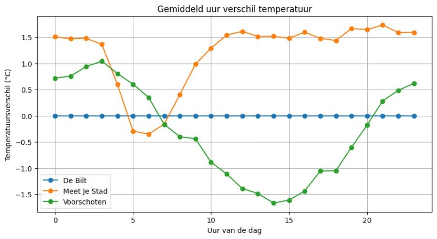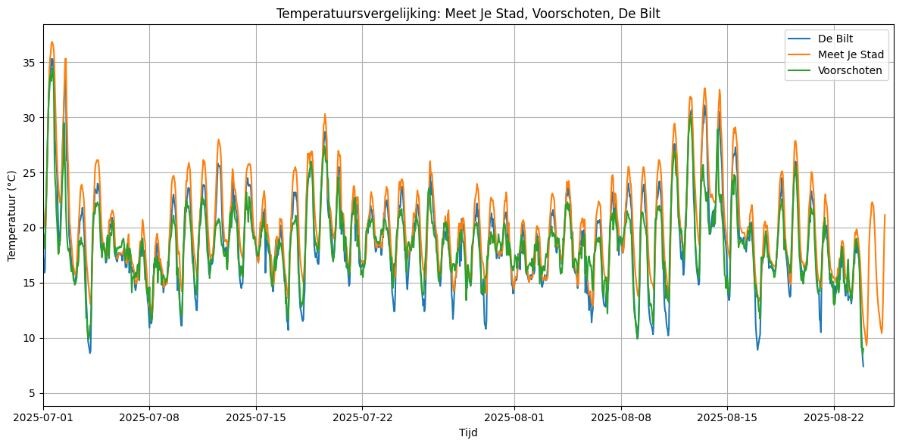 Hier zie je duidelijk dat de temperaturen die gemeten worden door de Meet Je Stad-kastjes in de stad dagelijks een hogere piek bereiken en gemiddeld hoger blijven dan in de Bilt en Voorschoten. Dit past bij wat je zou verwachten van het hitte-eilandeffect, omdat de kastjes van Meet Je Stad in een meer stedelijk gebied hangen.