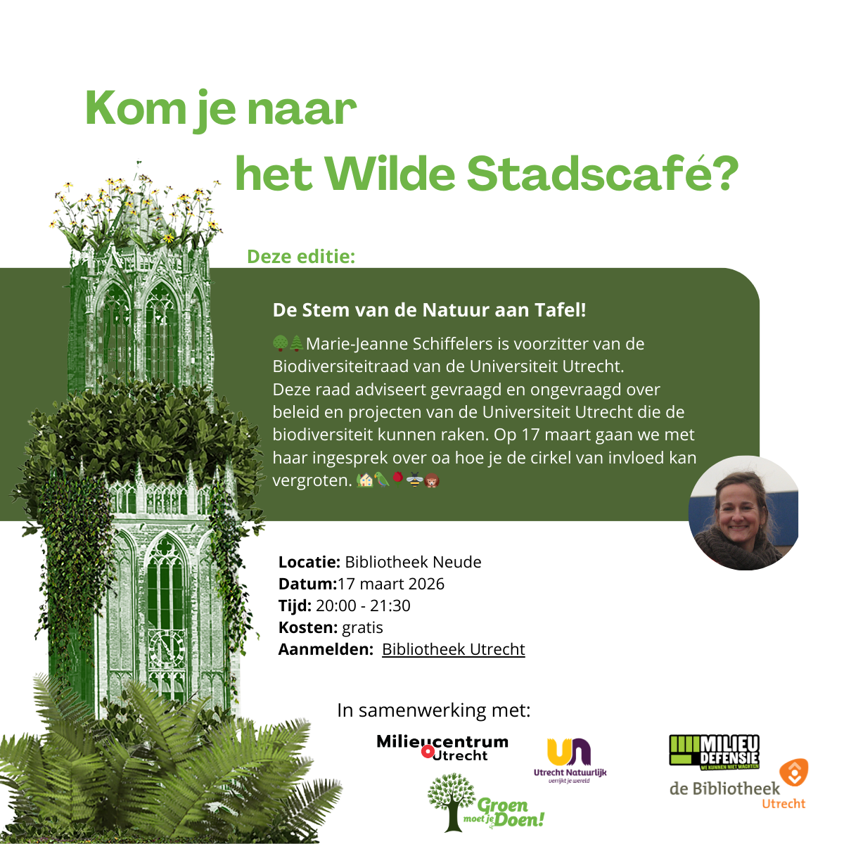 Het Wilde Stadscafé wordt georganiseerd door Utrecht Natuurlijk, Milieucentrum Utrecht, GroenmoetjeDoen! en Milieudefensie in samenwerking met Bibliotheek Utrecht.