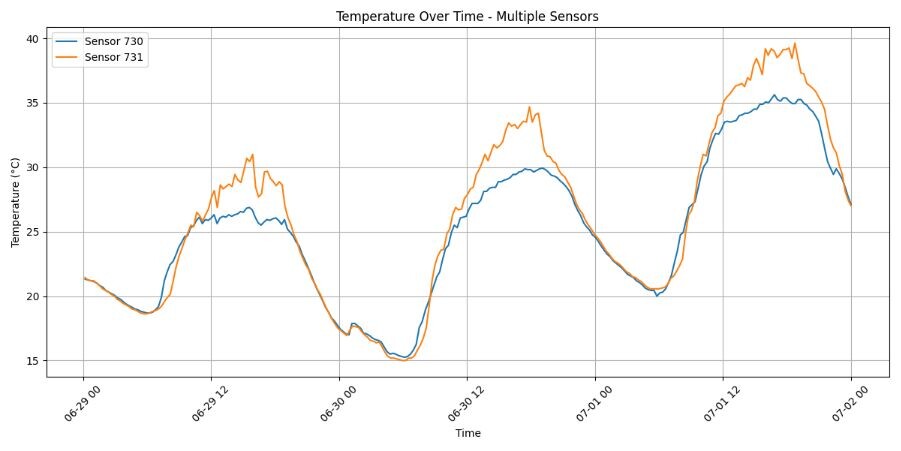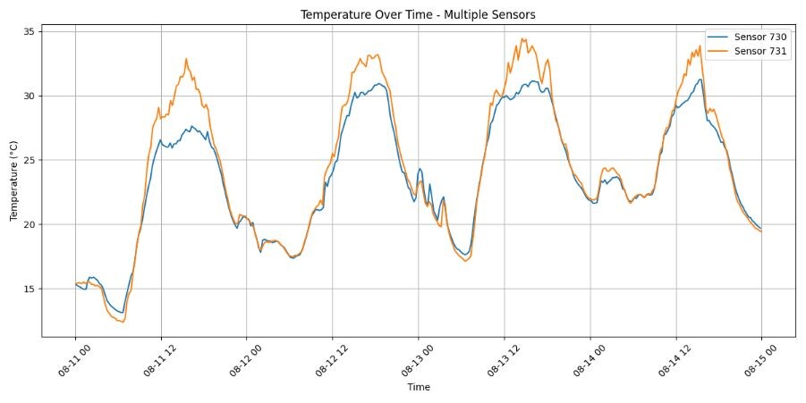 Bomen zouden een sterk verkoelende werking moeten hebben. De precieze sterkte van de verkoeling is niet eenvoudig vast te stellen omdat de locatie van de boom meespeelt – hoewel het project i-Tree 2.0-NL precies dat probeert te doen1. Omdat deze twee meetstations dicht bij elkaar staan en op afstand van gebouwen zouden ze een goed stel kunnen vormen om te vergelijken. Is het verkoelende effect – zoals volgens de theorie zou moeten bestaan – daadwerkelijk terug te zien in de metingen?